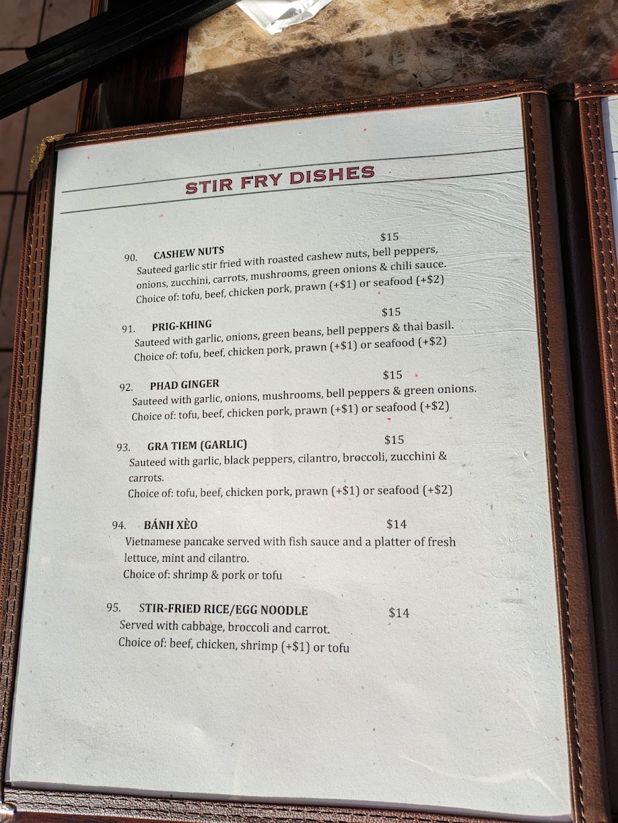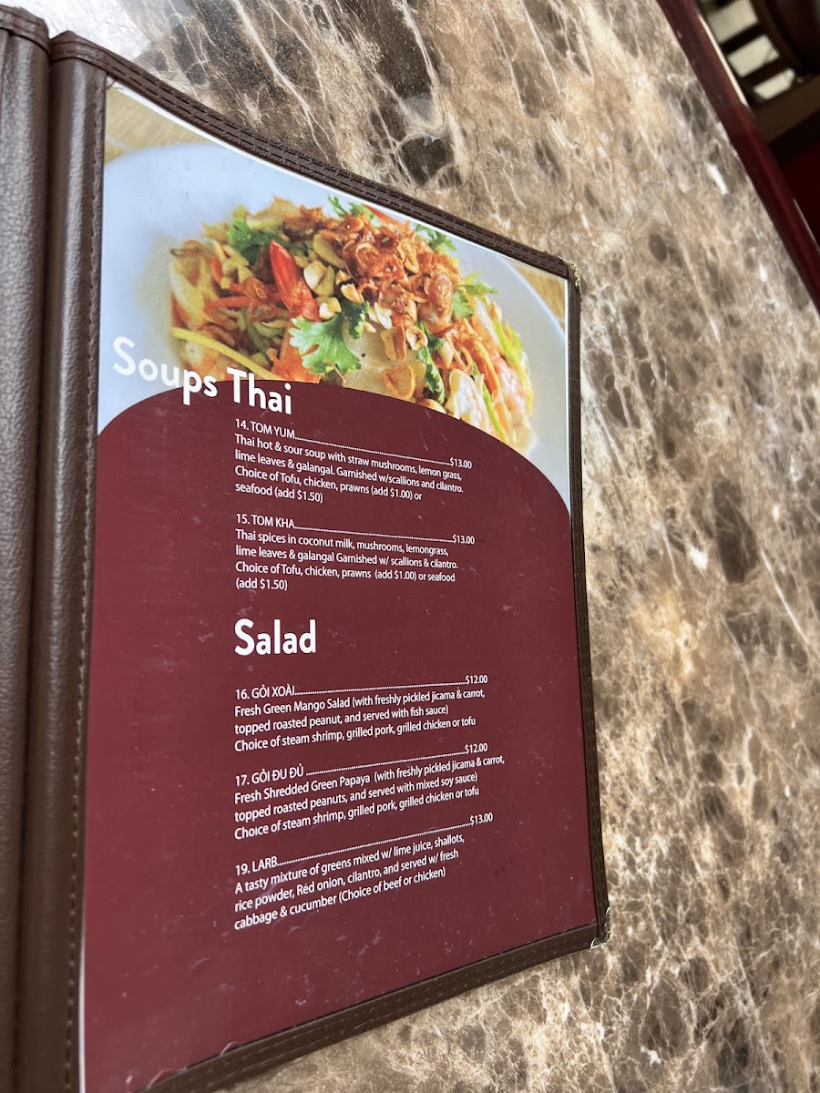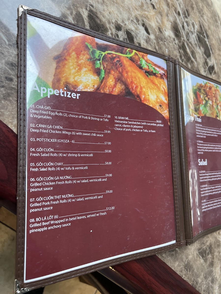 Expect to find comforting dishes like the traditional beef and chicken pho, served with rich, aromatic broth and generous portions of tender meats. For those seeking something bright and fresh, the grilled pork fresh rolls and mango salad provide a light, refreshing contrast. The menu also features a variety of Thai-inspired dishes such as green curry and Phad Thai, adding depth and diversity to the experience.